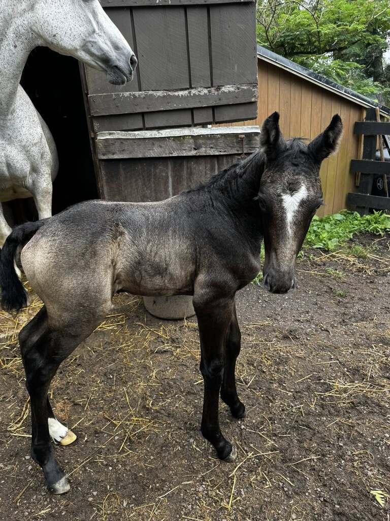 Nugget's first crop as a 3 year old was small, but he has two outstanding colts born in 2025. One is confirmed genetically black (with chrome) and the other is buckskin or smokey black.